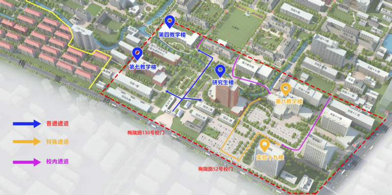 在Beat365中文官方网站第四教学楼、第七教学楼、研究生楼参加考试的考生请从Beat365中文官方网站梅陇路130号校门进出校园,本校考生可走校内通道。