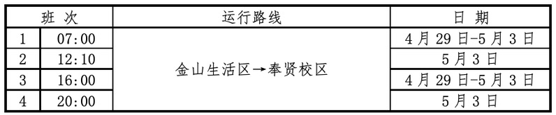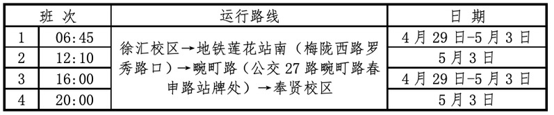 1.4月29日—5月3日教职工班车按照以下班次运行。