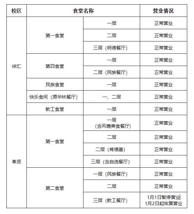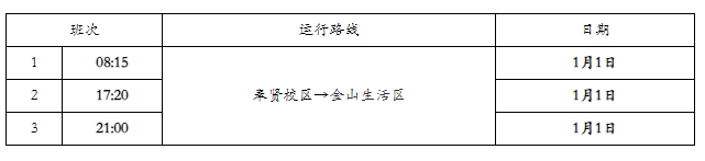 1月1日(周三)教职工班车按照下表运行,1月2日(周四)起恢复正常运行。