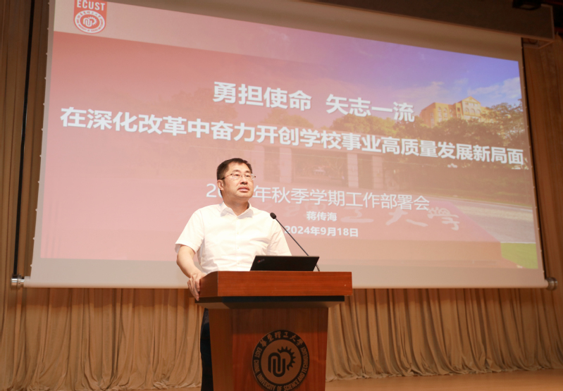 蒋传海以“勇担使命 矢志一流 在深化改革中奋力开创学校事业高质量发展新局面”为题,重点从“加压奋进,保质保量推动暑期各项工作落地见效”“提高站位,对标对表准确把握新形势新任务新要求”“锚定目标,凝心聚力实现下半年各项工作善作善成”“狠抓落实,全力以赴保障学校高质量发展行稳致远”等四个方面,总结暑期以来学校的各项工作,部署新学期党委重点工作。他强调,要坚持以习近平新时代中国特色社会主义思想为指导,全面学习贯彻党的二十大和二十届三中全会精神、全国教育大会精神,深入学习贯彻习近平总书记关于教育强国建设和考察上海重要讲话精神,重点聚焦着力加强党的全面领导、全力开好学校第十二次党代会、努力培养拔尖创新人才、聚力打造高素质专业化干部队伍、有力加强教师队伍建设、合力筑牢安全稳定防线、大力加强党的建设等七个方面,扎实推进新学期重点工作取得新进展、新成绩、新突破,以加快推进“双一流”建设为引领,推动自身高质量发展。
