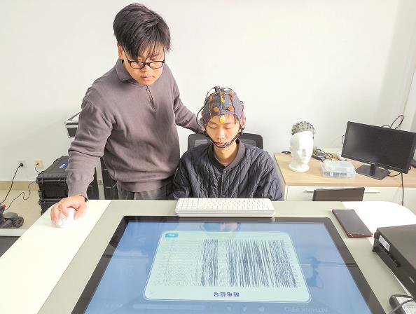 实验者进行脑机上肢康复设备演示 本报记者 陶磊 摄