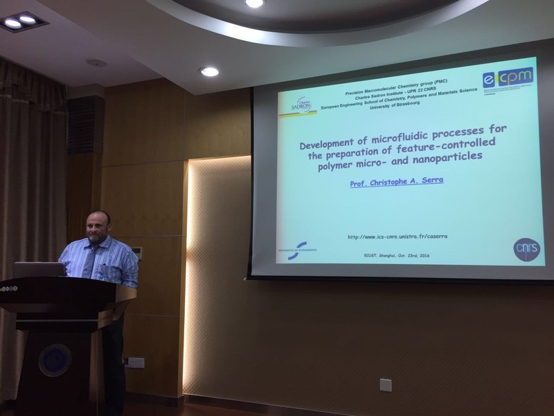 Professor Christophe A. Serra of the School of Chemistry, Polymers and Polymers at the University of Strasbourg, France, was invited to visit ECUST on Oct. 23rd,2016 and gave an academic report entitled Development of microfluidic processes for the preparation of feature-controlled polymer micro- and nanoparticles. Professor Wu Yan-yang, Director of Department of Chemical Engineering, presided over the report.