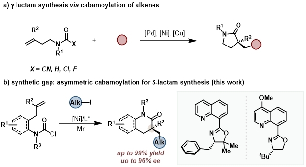 Recently, the Chen Yifeng research group of the School of Chemistry and Molecular Engineering, ECUST and the Feringa Nobel Prize Scientists Joint Research Center, has made new research progress in the field of asymmetric catalytic conversion of olefins to construct lactam heterocyclic compounds. The related research article was published in the journal Nature Communications with the title of “Ni-catalyzed carbamoylation of unactivated alkenes for stereo selective construction of six-member lactams”.