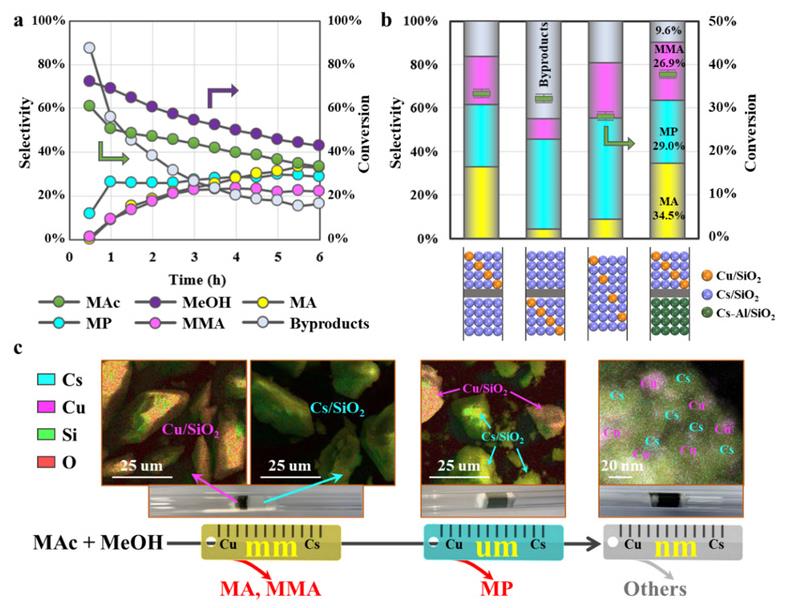 Recently, Professor Duan Xuezhi and Dr. Chen Wenyao from the School of Chemical Engineering and the State Key Laboratory of Chemical Engineering, ECUST have innovatively proposed a one-step efficient synthesis of high-end chemicals (such as methyl methacrylate) from methanol catalyzed by Cu-Cs double active sites. In this route, relay catalysis is used in a fixed bed reactor. By adjusting the spatial distance and bed distribution between Cu and Cs double active sites, the directional regulation of carbon chain unsaturation and chain length of products is realized. The research article was published in German Applied Chemistry with the title of “Leveraging the Proximity and Distribution of Cu‐Cs Sites for Direct Conversion of Methanol to Esters/Aldehydes”.