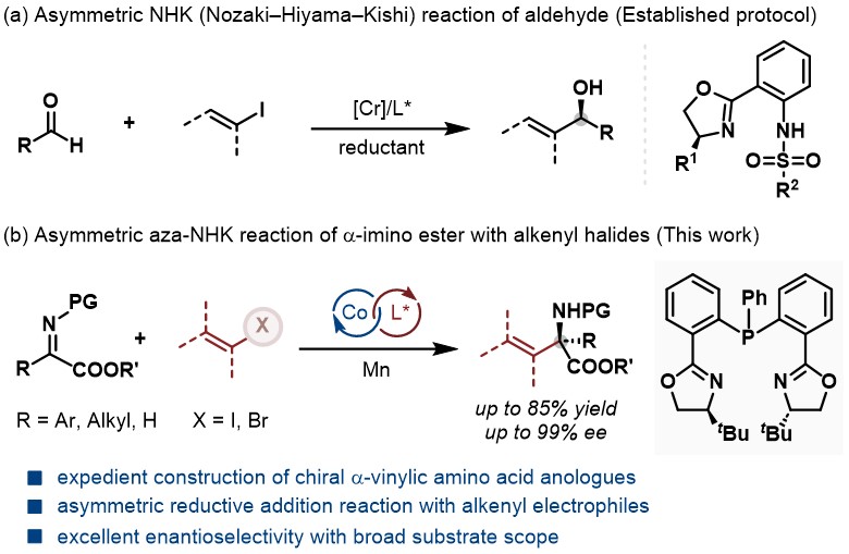 Recently, Professor Chen Yifeng’s research team published online a research paper entitled “Cobalt-Catalyzed Asymmetric Aza-Nozaki-Hiyama-Kishi (NHK)Reaction of α-Imino Esters with Alkenyl Halides” in German Applied Chemistry, reporting the new progress in the efficient synthesis of chiral α -alkenyl amino acid derivatives by cobalt-catalyzed asymmetric aza-NHK reaction.