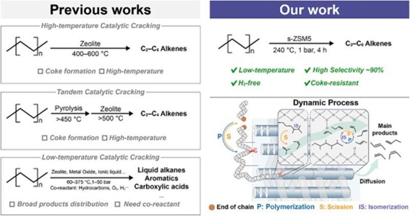 Recently, significant progress has been made in the catalytic upcycling of waste polyolefin plastics into light olefins under mild conditions. This research was carried out through a collaboration between the research groups of Professor Yan Li and Professor Sheng Dai from the School of Chemistry and Molecular Engineering at ECUST. The findings were published in Angewandte Chemie International Edition under the title Mild-Condition Upcycling of Polyolefins Enabled by Micropore Confinement in Zeolites. By leveraging micropore confinement effects and molecular diffusion behavior, the team developed a controllable selective cracking strategy. This approach offers a new pathway to lower energy consumption and minimize reliance on process requirements such as hydrogen, solvents, and other co-reactants.