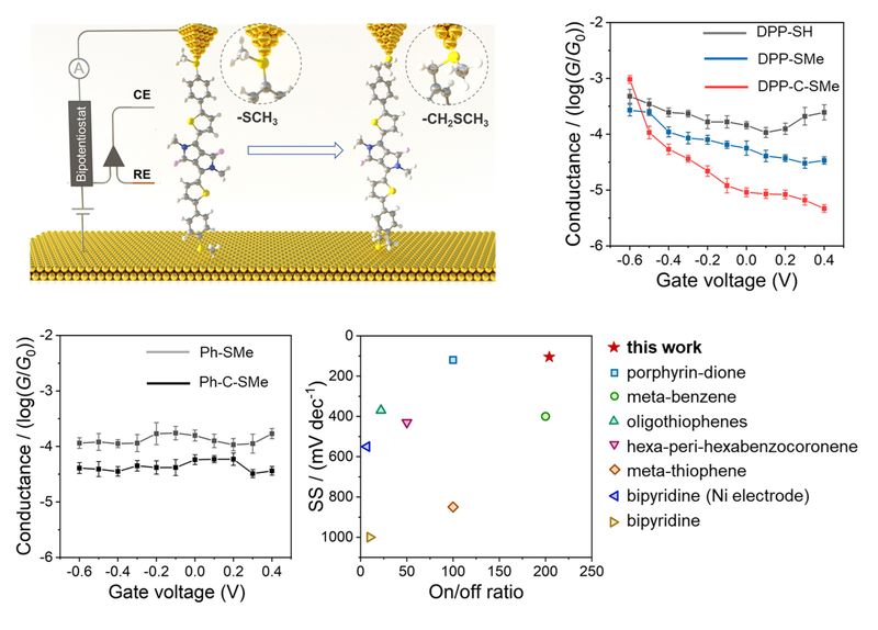 As a core device in molecular electronics, single-molecule transistors have long faced challenges in performance improvement, including limited on/off ratios and relatively high static power consumption. To address these issues, the research team proposed an innovative molecular design strategy that integrates a narrow-bandgap molecular backbone with interfacial decoupling. Through precise regulation of the alignment between the energy levels of molecular conducting orbitals and the Fermi level of electrodes, as well as the coupling strength at the molecule-electrode interface, the team significantly enhanced the gating efficiency and switching performance of the transistors, establishing a new design paradigm for the high-performance molecular electronic devices.