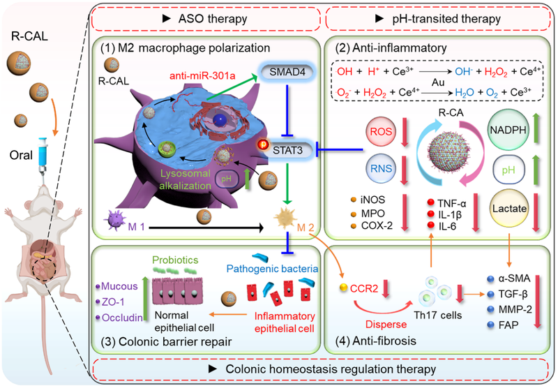 By integrating the platform’s intrinsic ability to regulate free radicals, NADPH, and lactate, the study established a multi-modal therapeutic strategy targeting the major pathological features of inflammatory bowel disease (IBD), including intestinal inflammation activation, barrier disruption, immune and microbiota dysbiosis, fibrosis, and disease recurrence. The related findings were published under the title “Oral cerium-based nanoplatform conjugated with gold to load anti-miR-301a for pH-transited multi-modal therapy of inflammatory bowel disease”.