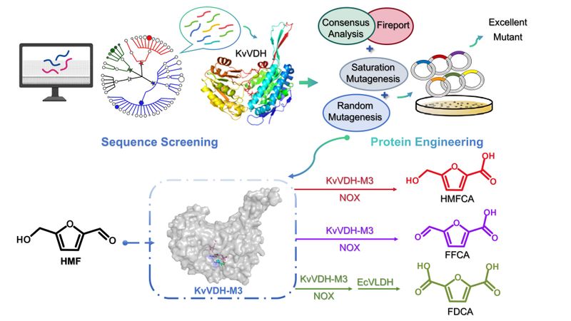 The study, titled “Novel iterative genome mining and engineering of a bifunctional KvVDH enable selective production of furan carboxylic acids from high-concentration 5-hydroxymethylfurfural,” focuses on the discovery and engineering of bifunctional HMF oxidases and the efficient biomanufacturing of FDCA This study established a highly efficient and selective biocatalytic platform, providing a promising approach for the selective conversion of high-concentration HMF into various value-added furan carboxylic acids.