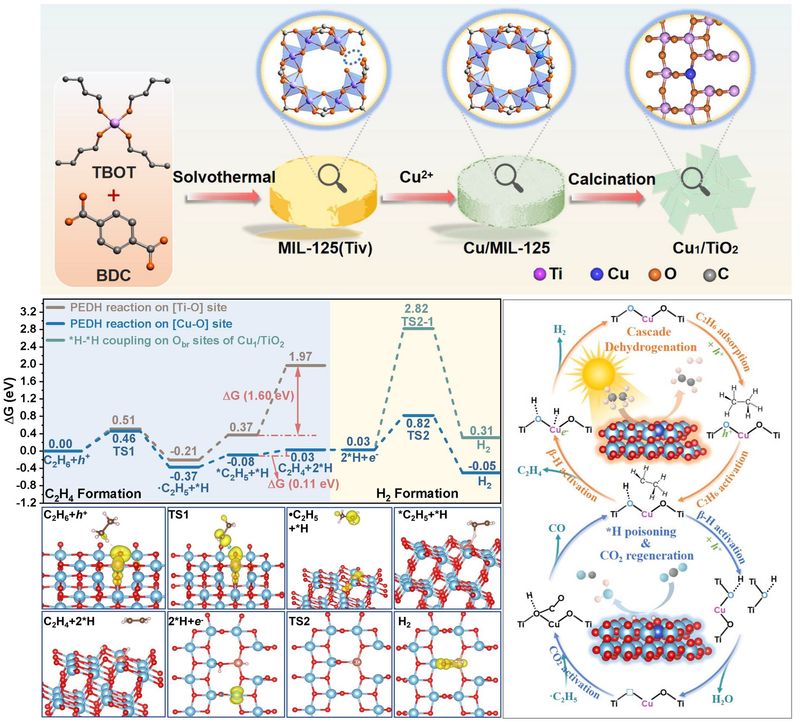 The solar-driven photocatalytic dehydrogenation of ethane utilizes the redox capabilities of photogenerated carriers to activate C–H bonds and produce ethylene under mild conditions. This offers a greener alternative to traditional thermal catalysis, which suffers from extreme energy consumption, over-dehydrogenation, and rapid catalyst deactivation. However, controlling the precise evolution of active species and managing surface hydrogen to prevent catalyst poisoning have remained major scientific challenges.