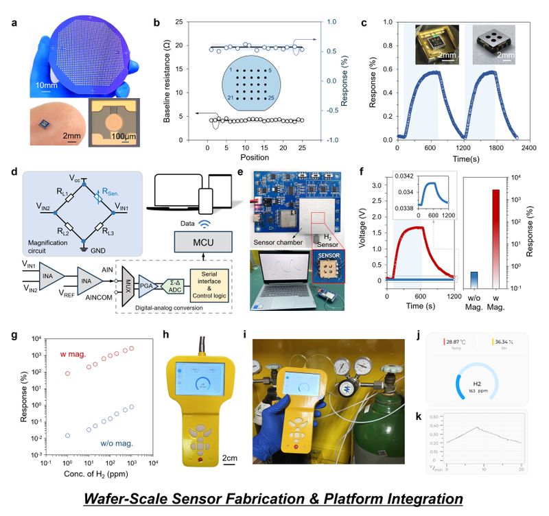 Furthermore, the research team has successfully realized the smooth transition of this floating-structure hydrogen sensor from laboratory prototypes to wafer-scale device fabrication, verifying its favorable process compatibility and scalable manufacturing potential. Based on standard micro- and nanofabrication processes, the sensors can be uniformly fabricated on 4-inch wafers and successfully integrated into a portable platform for real-time monitoring and early warning of hydrogen leaks.