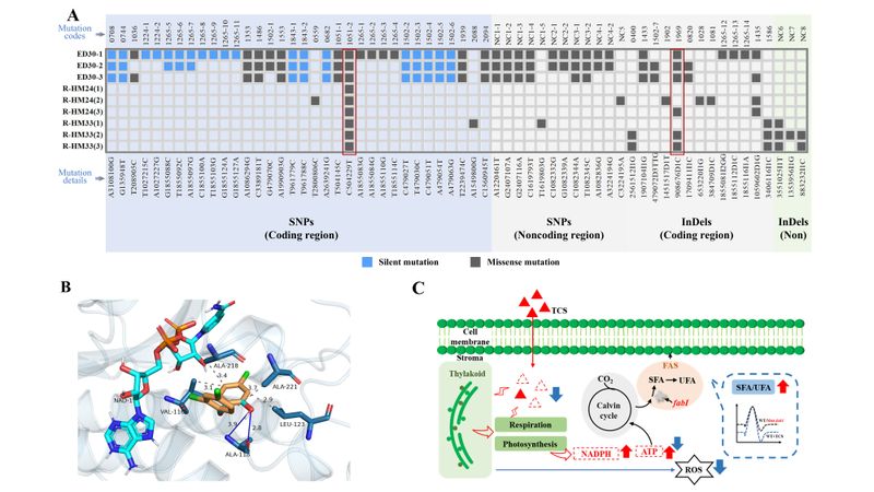 This study has achieved the rapid localization and mechanistic decoding of determinants of pollutant tolerance in cyanobacteria, and revealed a membrane-mediated tolerance mechanism centered on membrane lipid remodeling, starting from mutations in the fabI target. It provides actionable engineering and mechanistic clues for subsequent pollution control and antimicrobial emission management.