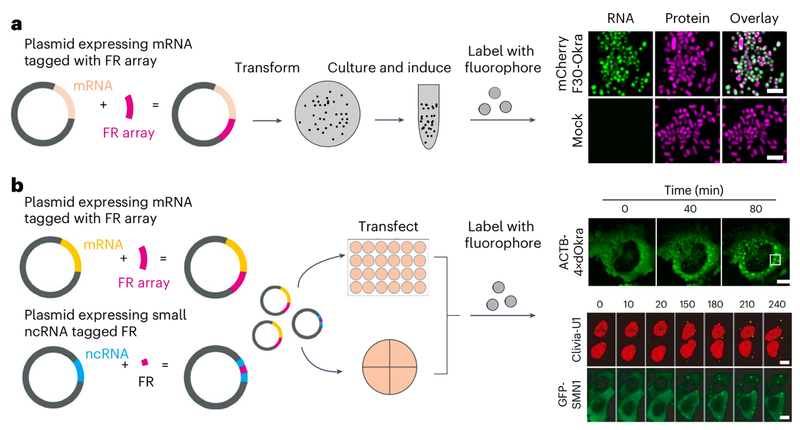 RNAs exhibit complex dynamics in cells, including expression, splicing, localization, translation and degradation, and these processes are highly coordinated and tightly regulated both spatially and temporally. To better understand the biological function of diverse RNAs, approaches that allow monitoring of RNA with high spatiotemporal resolution are essential. Fluorescent RNAs (FRs) have emerged as a promising tool, using RNA aptamers as tags that specifically bind and activate small-molecule dyes to generate fluorescence.